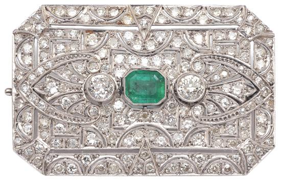 The large pierced rectangular plaque of geometric design, centrally set with an octagonal emerald, flanked by two principal old European cut diamonds within a diamond set surround in millegrain decoration, in platinum.