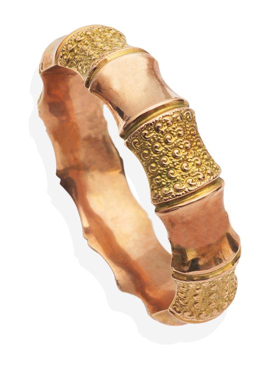 The wax filled hinged bangle of textured and polished finish, in 9ct rose and yellow gold.