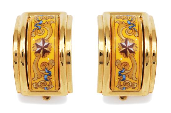 The half hoops with scroll and star decoration on a yellow background, to clip fittings, all in gilded sterling silver.