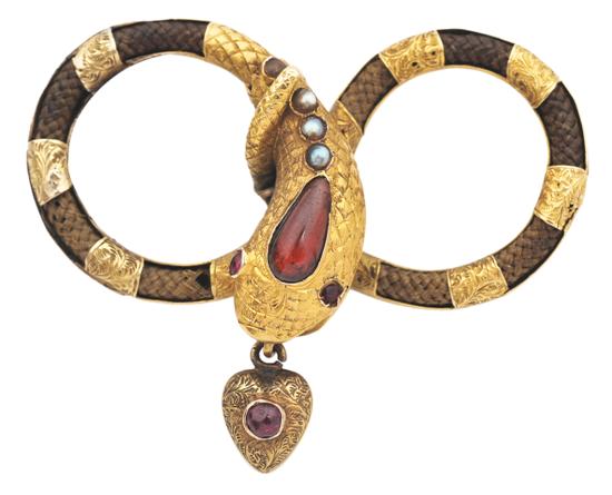 The finely detailed serpent in figure of eight coil, with plaited hair inlay, set to the head with a pear shaped garnet cut en cabochon and seed pearl detail, suspending a garnet set heart pendant, in 18ct gold.