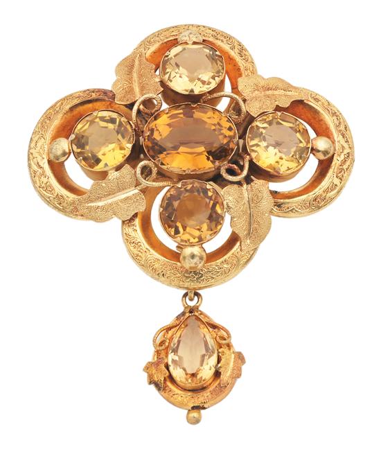 Comprising five citrines in an open mount of chased and applied foliate decoration, suspending a detachable citrine pendant drop, all in 15ct gold, boxed.