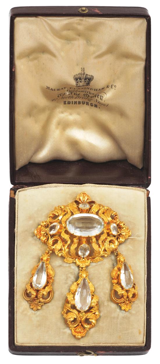 Comprising five aquamarines within an open scrolled mount of chased and applied foliate decoration, suspending three aquamarine set drops, in 15ct gold, retailed by Mackay, Cunningham & Co, in original fitted box.