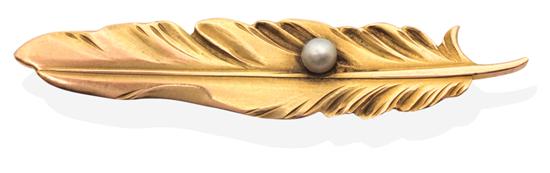 The finely detailed feather set with a single seed pearl, in 14ct gold.