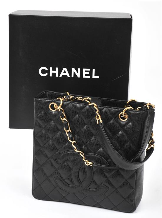Styled in quilted black caviar leather the gussetted tote with monogrammed front and short leather and chain straps , 25 x 24.5cm, boxed.