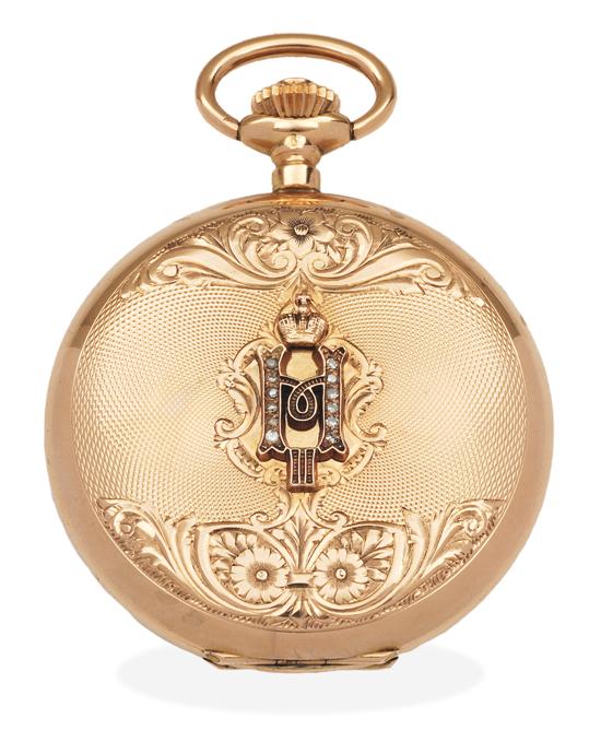 Crown wind movement, full hunter, circular silvered textured dial with black Roman numerals, subsidiary seconds dial at six, 14ct rose gold engine turned and engraved case, applied diamond set 'H' to the front with crown motif, made for the Imperial Russian market and bares the Russian '56' gold hallmark, case number 219, 45mm diameter.