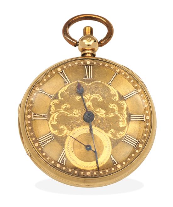 Key wind fuse lever movement, open face, circular engraved golden dial with raised Roman numerals, subsidiary seconds dial at six, 18ct gold engine turned case with engraved cartouche, case hallmarked H.G, 42mm diameter, circa 1887.