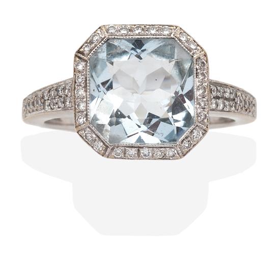 Centrally set with a square scissor cut aquamarine within a fine border of round brilliant cut diamonds and diamond set shoulders, in 18ct white gold, ring size M-N.