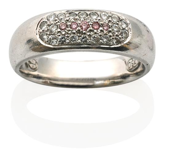The wide half round band with central panel of pave set pink and white diamonds, in 18ct white gold, ring size K-L.
