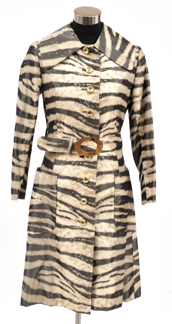 Labelled ' Le Louvre Melbourne', the tiger printed taffeta single breasted coat with set in sleeves patch pockets and self covered belt.