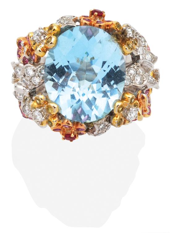 Centrally set with an oval topaz, within a floral surround set with coloured sapphires and diamond set butterfly detail, in 18ct white gold, ring size I-J.