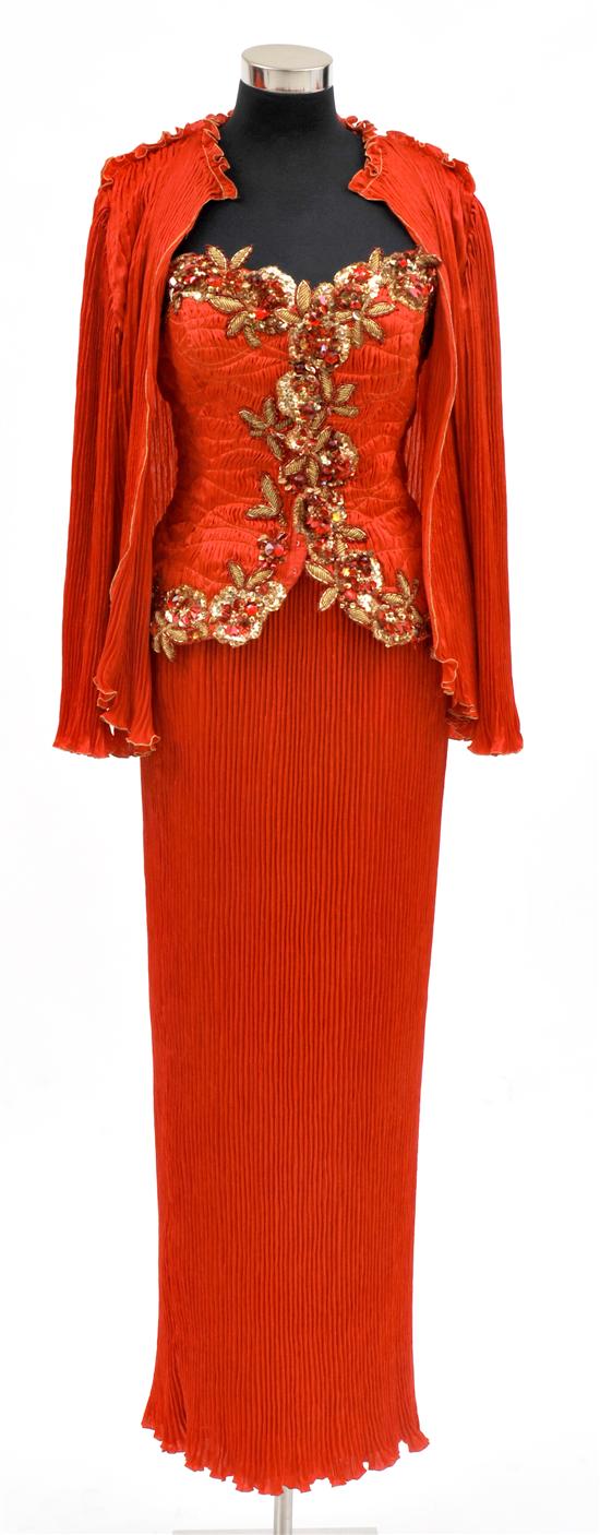 Labelled 'Gregory Ladner', featuring an elaborate boned corset of accordian pleated red satin heavily embellished with beaded and sequinned floral motifs included with a matching evening length skirt and long sleeved jacket each of accordian pleated red satin.
