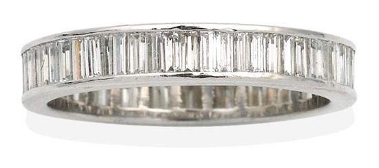 Comprising a full circle of baguette cut diamonds totalling 1.40cts, in 14ct white gold, ring size O-P.