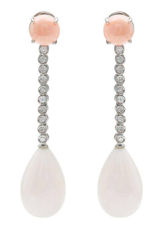 Each earring comprising a white pear shaped coral drop suspended below a vertical row of round brilliant cut diamonds, to a pink coral stud, to post and clip fittings, in 18ct white gold.