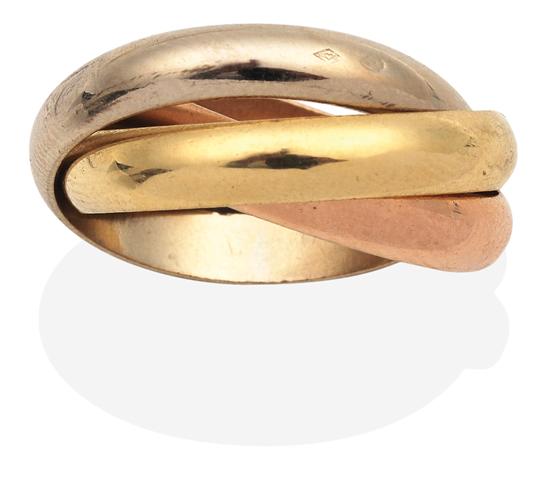 Comprising three interlinked bands in 18ct tri-colour gold, ring size L-M.