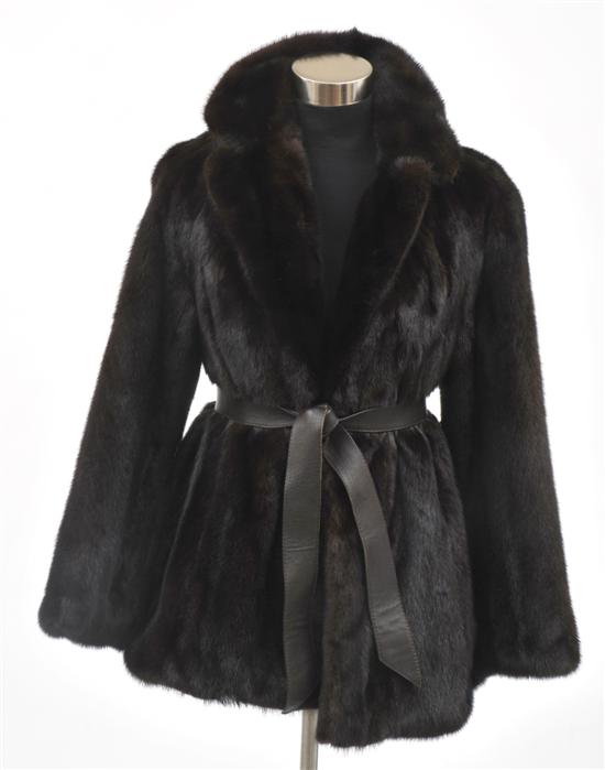 Labelled ' A Cornelius Original Sydney', the flared short stranded coat with deep collar and revere, slash pockets to front and a contrast leather tie belt.