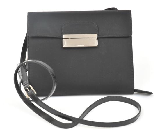 Styled in black nylon the fold up bag with zipped interior for card and bill compartments, and long narrow shoulder strap, 18 x 15 cm, boxed.