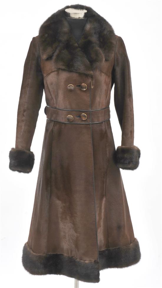 The double breasted three quarter length coat with mink collar and revere, cuffs and hem, shaped through the waist with a belted panel and with edges piped in leather.