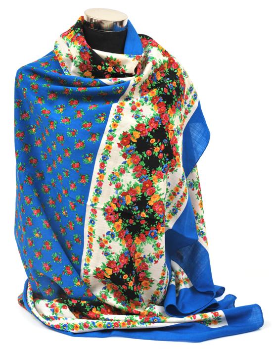The scarf displays a repeat floral bouquet on a cyan blue ground with a border of further floral cartouches, 140cm square.