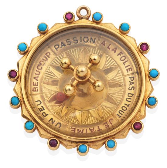 Modelled as a fully functional roulette wheel studded along the edge with collet set rubies and turquoise, with central crystal dome over the wheel, engraved with French messages of love, in 18ct gold.