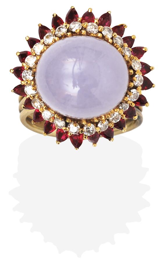 Of cluster design, the central lavender jade cut en cabochon set within a border of round brilliant cut diamonds and pear cut rubies, in 14ct gold, ring size N-O.