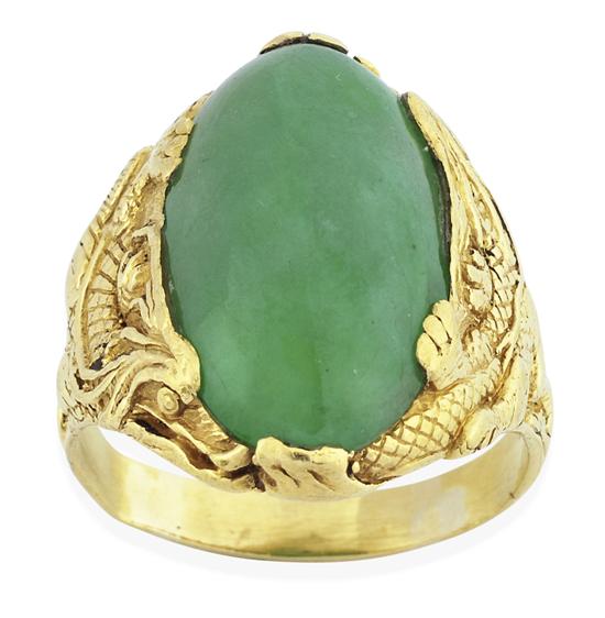 Centrally set with an oval jade cut en cabochon within an oriental decorative mount, in 22ct gold, ring size X-Y.