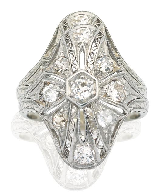 The pierced plaque set with nine old European cut diamonds in millegrain decoration, in 18ct white gold, ring size J-K.