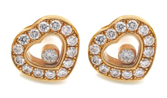 From the 'Happy Diamonds' range, each heart shaped diamond set stud encasing a floating diamond, to post and butterfly fittings, in 18ct gold.