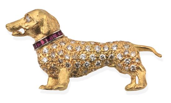 The finely detailed dachshund pave set with round brilliant cut diamonds with carre cut ruby set collar, in 18ct gold.