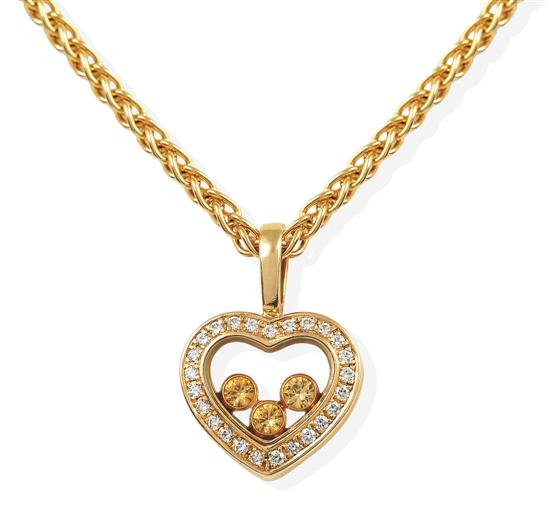 From the 'Happy Diamonds' range, the heart shaped diamond set pendant encasing three floating yellow diamonds, to a fancy link chain, in 18ct gold, total length 450mm, boxed.