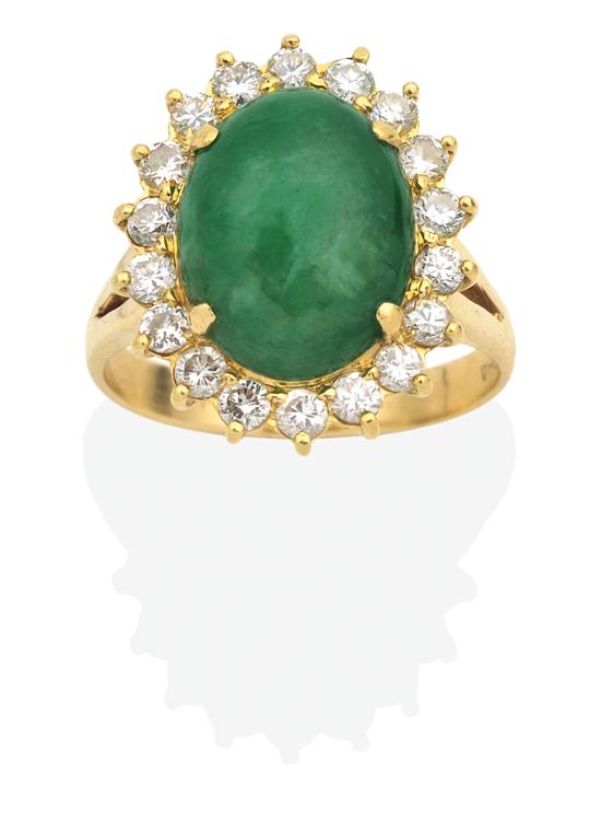 Of cluster design, centrally set with oval jade cut en cabochon, surrounded by a border of round brilliant cut diamonds, in 14ct gold, independent valuation available, ring size L-M.