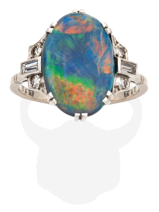 The central solid oval opal weighing 2.90cts, flanked by baguette and single cut diamonds to each shoulder, in 18ct white gold, ring size K-L.