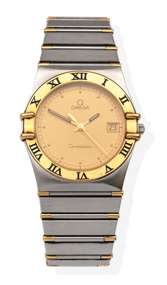 Quartz movement, circular golden dial with baton numerals, sweep seconds hand, date aperture at three, signed case, dial and movement, fixed gold bezel with enamelled Roman numerals, stainless steel and 18ct gold case with conforming bracelet bands, total length 190mm, 32mm diameter.