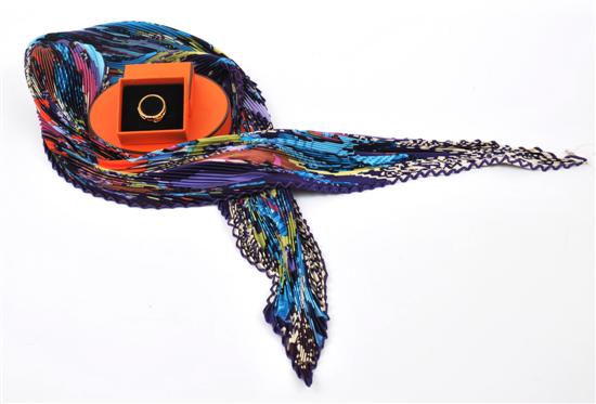 The multi-coloured pleated scarf with 'Zabarushka' design on a purple background, total length 125cm, with original box.