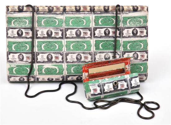 Styled in an Andy Warhol inspired print of repeat US dollar motifs to the exterior and Campbells soup cans to the interior, with matching lipstick case and optional long shoulder chain, 24 x 13cm.