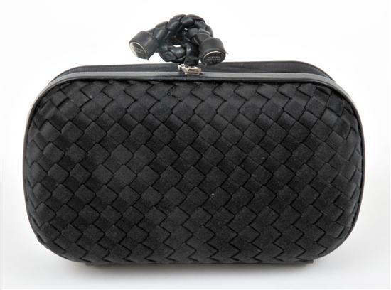 Styled in woven satin ribbon, the oval hard cased clutch finished with a plaited leather knot to clasp, 16 x 10cm.