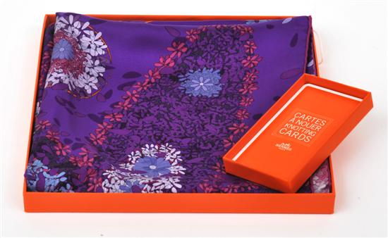 The 'Offrandes' floral design in shades of purple and pink, 88cm square, with a set of scarf knotting cards and original box.