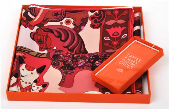 The 'Zabarushka' design in shades of purple and pink, 88cm square, with a set of scarf knotting cards and original box.