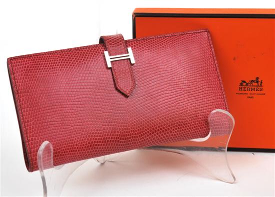 Styled in fuschia lizard leather for bills, credit cards and with zip compartment, 17 x 9cm, with original box.