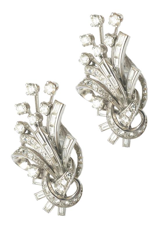 Of spray design, each earring claw and bead set with round brilliant, single and baguette cut diamonds, to clip fittings, in 18ct white gold.