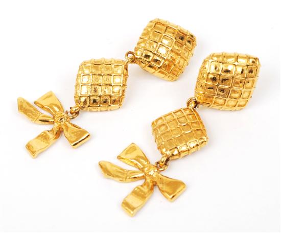 The quilted double lozenge shape with further bow drop detail, all in a gilt metal finish, to clips fittings.