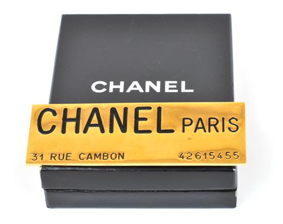 The rectangular plaque impressed with Chanel Paris 31 Rue Cambon 42615455, in a gilt metal finish, boxed.