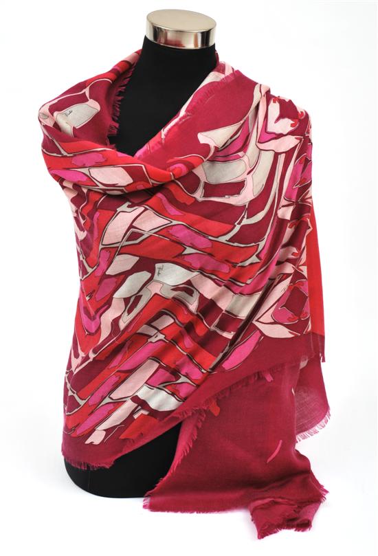 The rectangular scarf printed with a fushia and cyclamen pink design, 66 x 175cm.