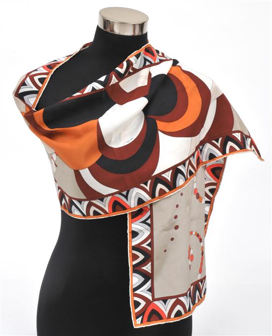 The rectangular scarf printed in a tobacco, tangerine and black design, 32 x 175cm.