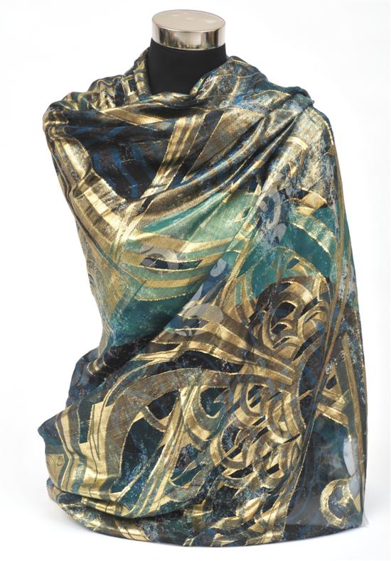 Printed in ocean tones and woven with a metallic gold design, 135cm square.