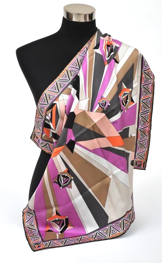 The square scarf printed in a pink, peach and taupe design, 68cm square.