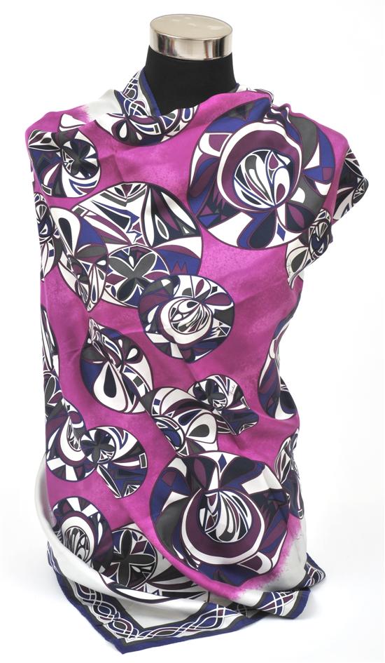 The square scarf printed in a royal blue, magenta and black design, 88 cm square.