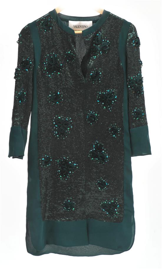 Labelled ' Valentino', cut as a collarless tunic style with long sleeves in forest green georgette and applied with self coloured sequins and passementarie.