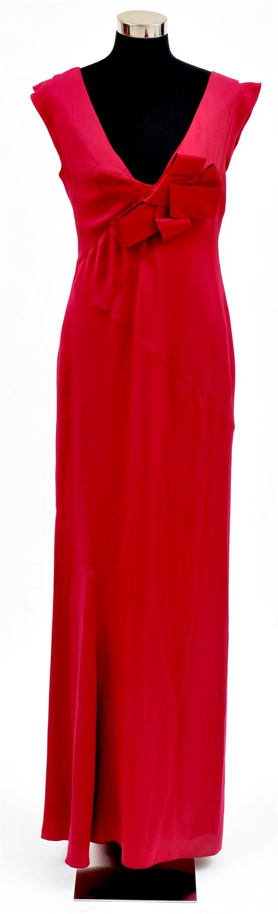 Labelled 'valentino', the fushia v-neck evening length gown with capped sleeves and an applied passementarie detail to bodice, labelled size 10.