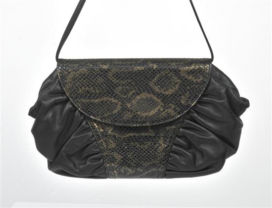 Styled in black leather the oval gathered bag with faux python inset feature and flap with long shoulder strap, 29 x 16.5cm.
