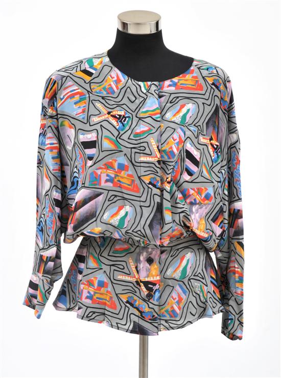 Labelled 'Karl Lagerfeld', the collarles button through blouse with three quarter cuffed sleeves and peplum waist cut in an abstract holiday print, labelled size 44.